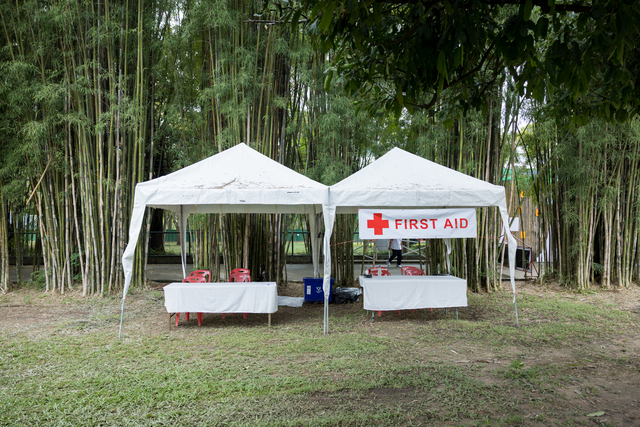上げ場付近には怪我や火傷に備えて、赤十字の応急処置場(First Aid)も設置されてます。