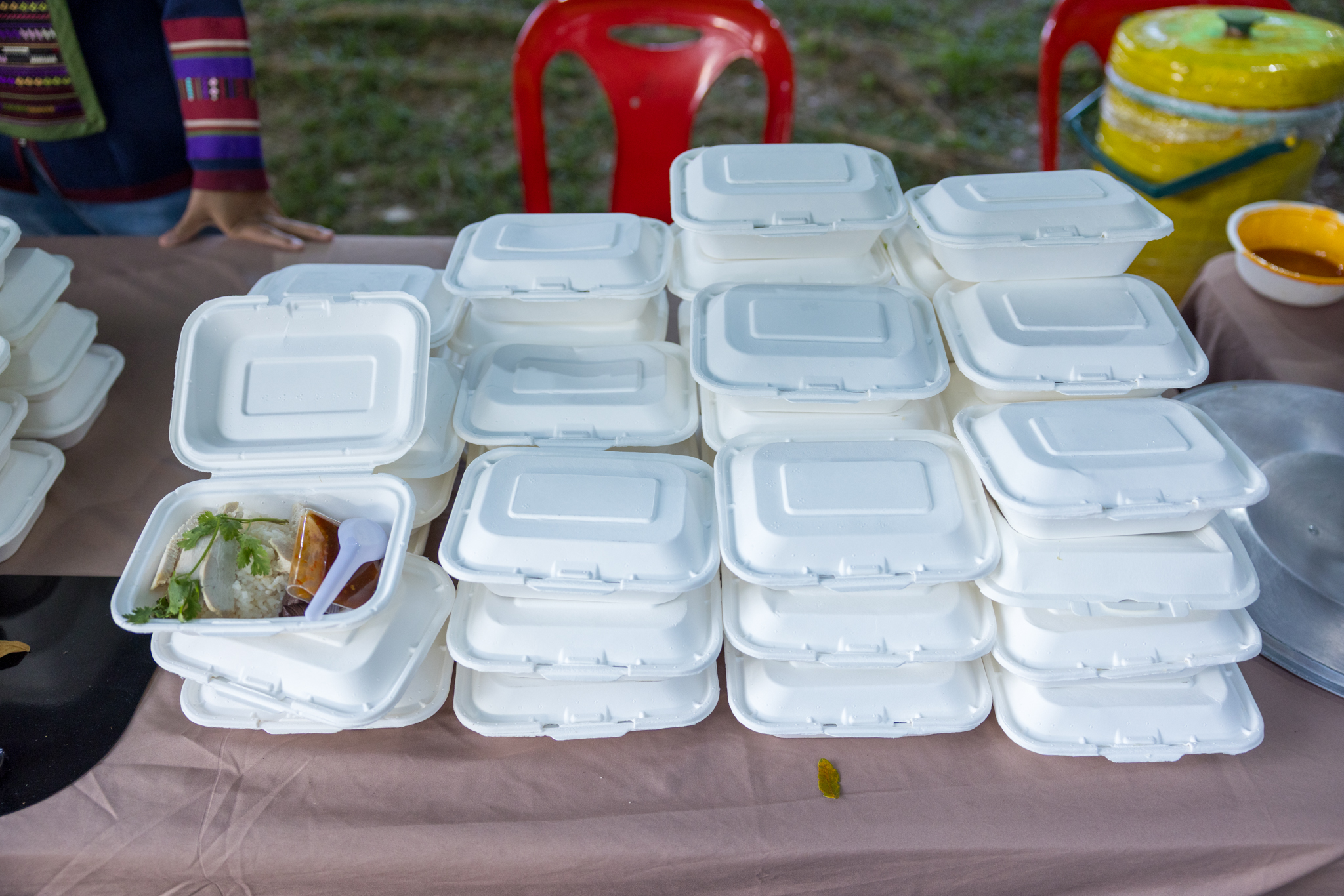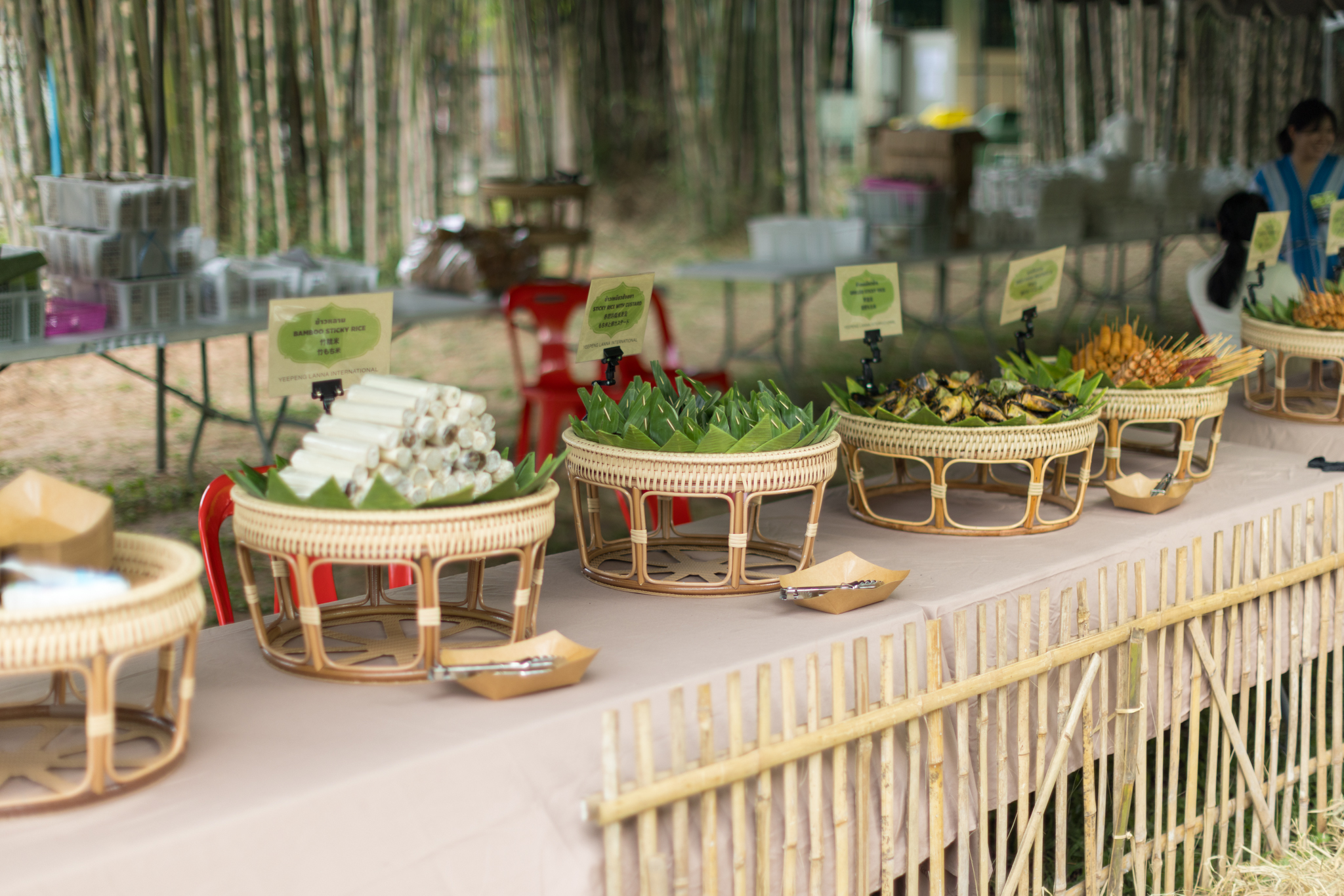 この場所では手提げグッズ(記念品、虫除けスプレー、雨かっぱ)を民族衣装を着たスタッフより受け取ります。