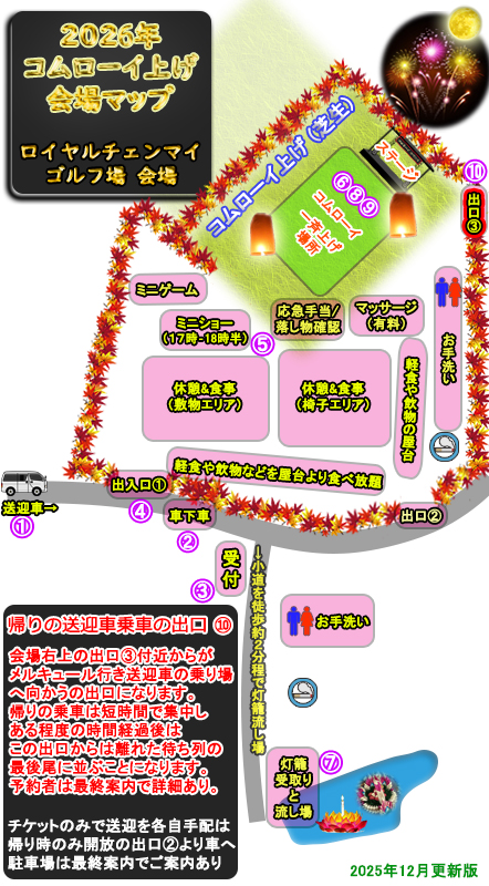 ロイヤルチェンマイゴルフ場の会場に到着 会場内の屋台の飲食の食べ放題 (昨年食事メニューはクリックで一時表示 惣菜、軽食、飲物) 北部タイや民族舞踊、灯籠流し、ミニゲーム等を各自お楽しみ |