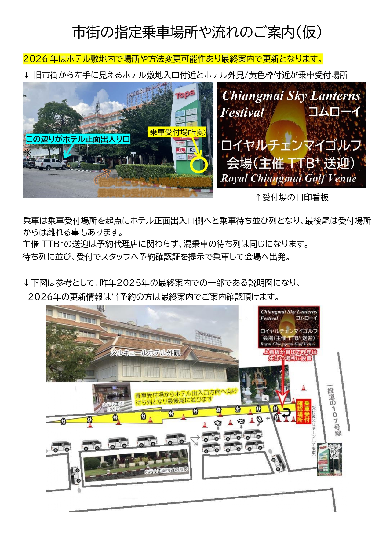 | 含まれるもの | 主催TTB+手配のエアコン付きハイエース型混乗車での指定場所から会場への往復送迎 チケット(上げ場の座席、ランタン2つ/VIP3つ、記念品、会場内飲食、流し灯篭) |