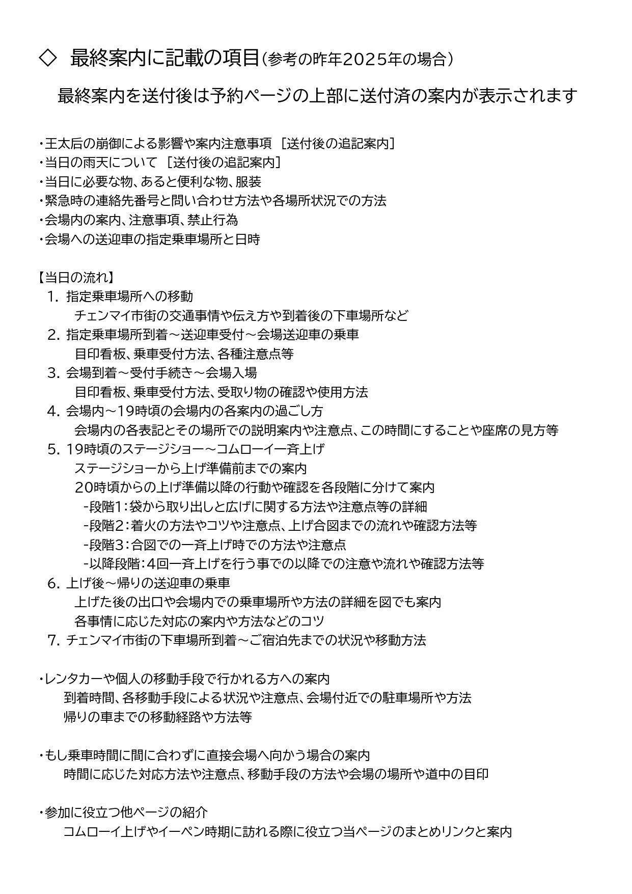 | 含まれるもの | 主催TTB+手配のエアコン付きハイエース型混乗車での指定場所から会場への往復送迎 チケット(上げ場の座席、ランタン2つ/VIP3つ、記念品、会場内飲食、流し灯篭) |