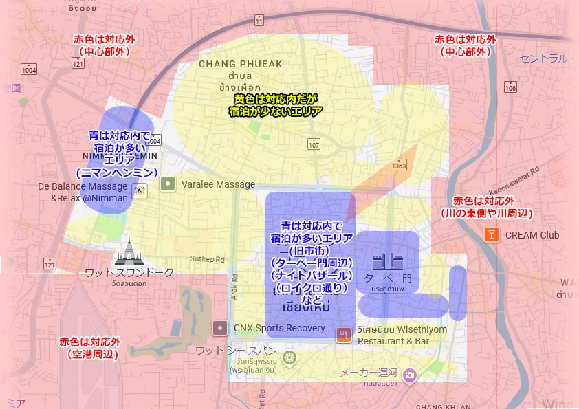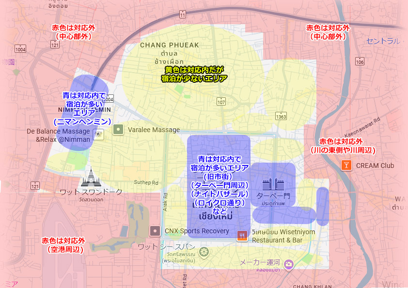 ナイトバザール、ターペー門、旧市街、ニマンヘンミン通り、サンティタムは範囲になります。